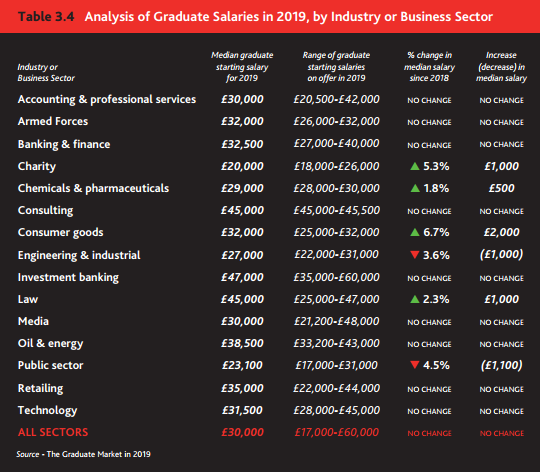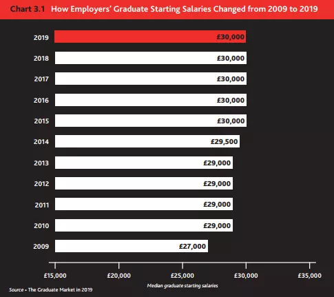 关于英国顶级雇主的毕业生起薪,数据显示中到了2010年,由于经济衰退,起薪中位数直到2013年在四年内保持不变,为29,000英镑。2014年薪资略有增加,进一步缓和。2015年上升,首次将毕业生起薪中位数提高到30,000英镑。而2019年中位数预计仍然为30,000英镑。至少有六分之一的知名研究生专业毕业生的起薪超过40,000英镑,有9家最知名雇主开出了45,000英镑的薪酬。