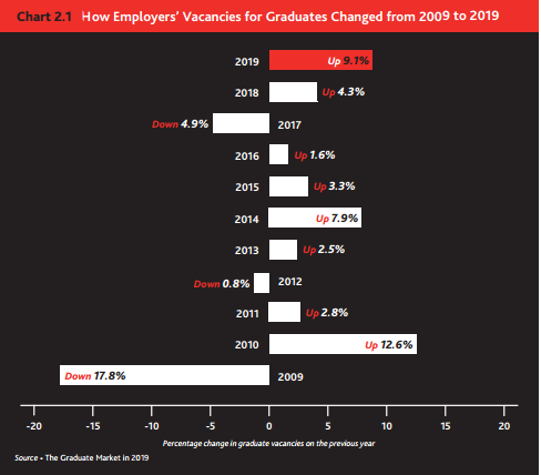英国《2019毕业生就业报告》(The Graduate Market in 2019,简称“报告”)由致力于研究英国一流大学毕业生就业状况的市场调查机构High Fliers Research发布。
