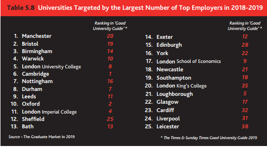 根据报告显示,2018-2019学年最受雇主追捧的十所大学分别是曼彻斯特大学,布里斯托大学,伯明翰大学,华威大学,伦敦大学学院,剑桥大学,诺丁汉大学,杜伦大学,利兹大学和牛津大学。