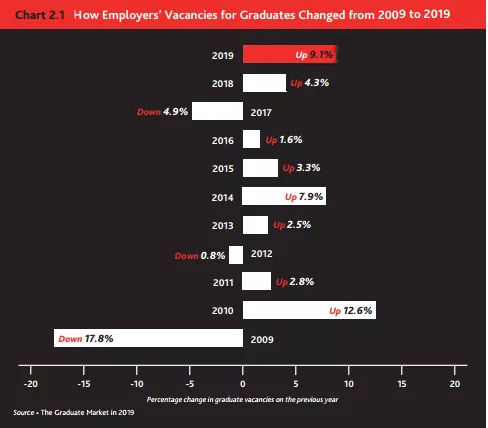 根据报告显示,毕业生招聘于2018年有所反弹,预测2019年15个主要行业和商业部门中的11家雇主今年应届毕业生招聘人数将会大幅增加,将达到2010年以来最高增长幅度。顶级雇主发布的职位空缺增加9.1%。