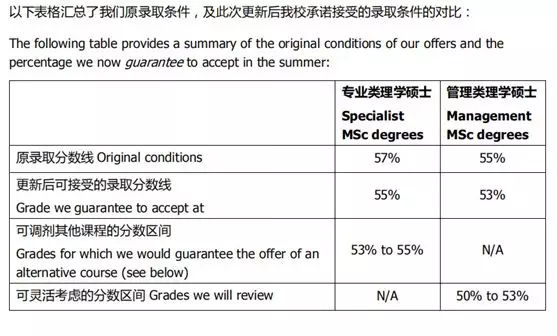 萨塞克斯大学商学院2019年9月入学的录取要求有重要更新,原offer要求57%的,目前可以接受55%入学;原offer要求55%的,目前可以接受53%以上入学,且专业调剂方案比较灵活,详情请参考下图。