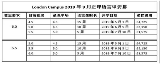 伦敦校区的所有课程均可配语言班,2019年9月及2020年1月语言课安排如下: