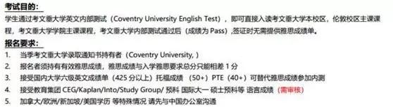 考文垂大学针对2019年9月正课入读提供6&7月常规内测,以下内测考试不可用于参加考文垂大学国内语言班 6 周,10 周(南京)入学 。如已经参加国内语言班同学,不可报名以下常规内测考试,同一个同学可以参加多次内测,两次考试时间需要间隔 2 个月(60 天以上),报名时需要提交最近一次参加内测时间,同时考试资格需要中国办公室审批通过,方可参加。场次和报名等信息详见下图: