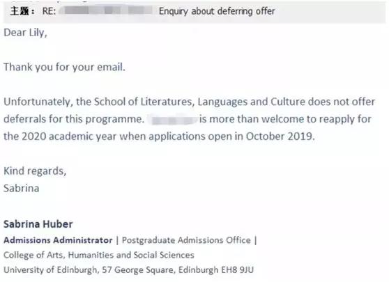 已收到学校邮件确认,爱大今年School of Literatures, Languages and Culture不能defer offer,需等下一年申请开放后重新递交申请,见如下截图: