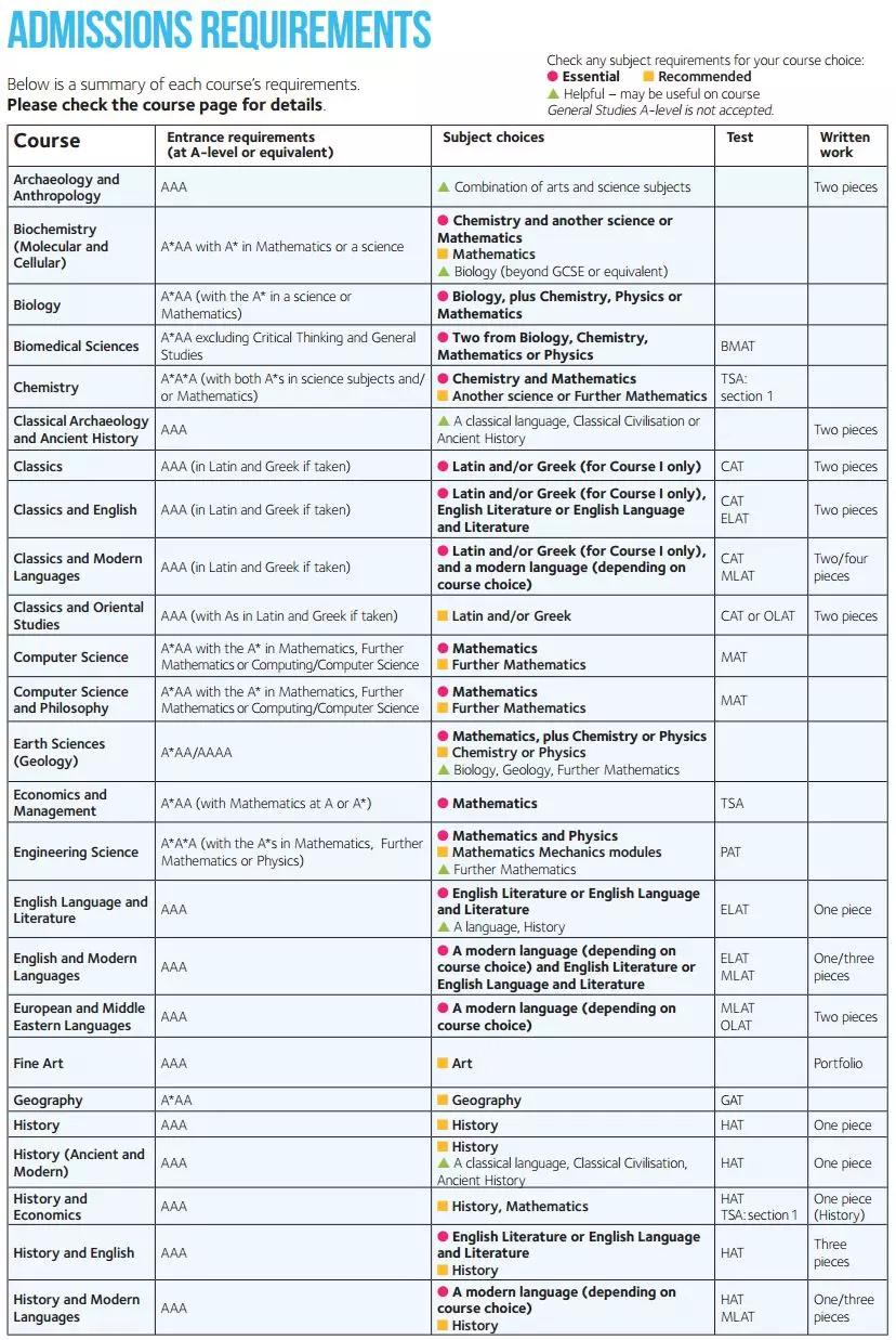 牛津公布的admission requirements,不同学科专业/课程对A-Level成绩和科目、附加考试和书面作品/小论文的要求一目了然。