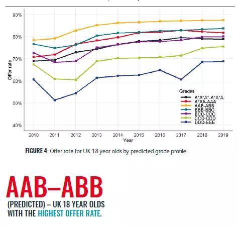 英国18岁的申请学生预估成绩在AAB – ABB的最有可能获得87.5%的录取机会。这是一个新的记录,在2019年增加了0.1个百分点。