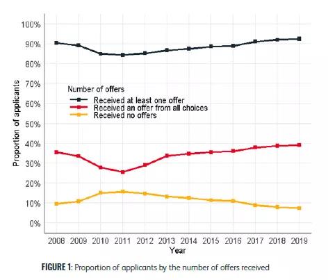 589,845名申请者在2019年收到了至少一份offer。主要申请周期中(6月30日前申请),92.5%(589,845人)的申请者至少获得一份offer,同比增长0.7%。不足50,000人一个offer没有收到,不过之后可以参加Extra 与 Clearing。