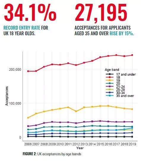 30岁以上的英国申请人数量显著增加。在30 - 34岁的人群中,接受率增长了8.7%,达到13395人。35岁及以上年龄段的比例变化最大,为15%,首次达到27,195人(该年龄段之前的记录是2018年的23,640人)。