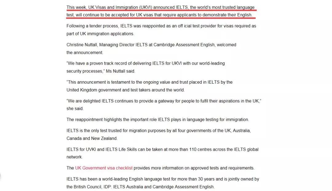 剑桥大学英语考评部雅思考试总裁Christine Nuttall表示,“得益于全球领先的安全管理流程,我们在运营用于英国签证及移民的雅思考试(IELTS for UKVI)方面有着公认的良好记录,再次获得认可证明了英国政府和全球考生对雅思考试的持续重视和信任。我们很高兴雅思能继续为人们提供在英国实现梦想的通道。”