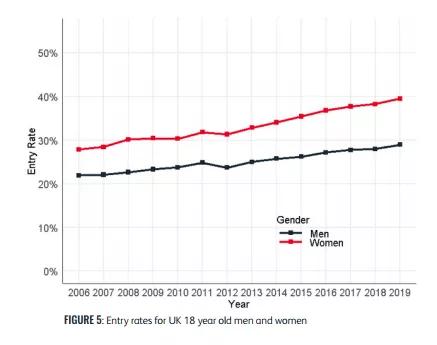 · 英国本科录取率,女性明显高于男性。
