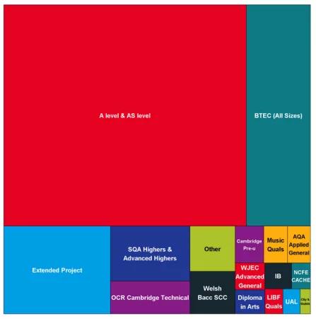 ▲ 2019申请季,A level依然是英国本土学生使用人数最多的资格考试,占58%,比去年下降1.2%。