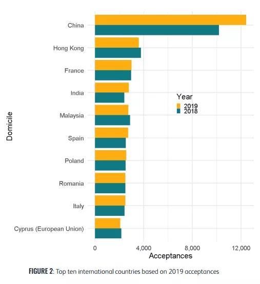 根据这份报告,在已经结束的2019申请季,英国大学本科录取的中国内地学生人数,达到创纪录的12,415人,比2018申请季增加了2,235人,增幅高达22%!