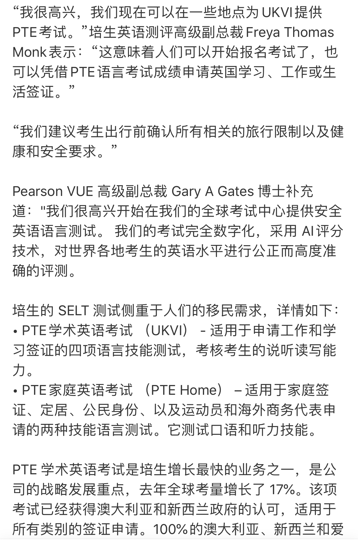 根据英国移民局官网的最新信息,更新了英国签证及移民局(UKVI)认可的英语语言考试列表,目前可接受PTE UKVI用于办理签证。同时,PTE中国官网也发布了这个好消息,从即日起,包括中国在内的首批20个考点开始接受报名预订,其中国内11个考点即日开放考试,包括北京/上海/广州(培生专属考点),新增4个临时考点,分别为北京/上海/广州/深圳。而其余 9 个考点将在 COVID-19 限制取消后开放。