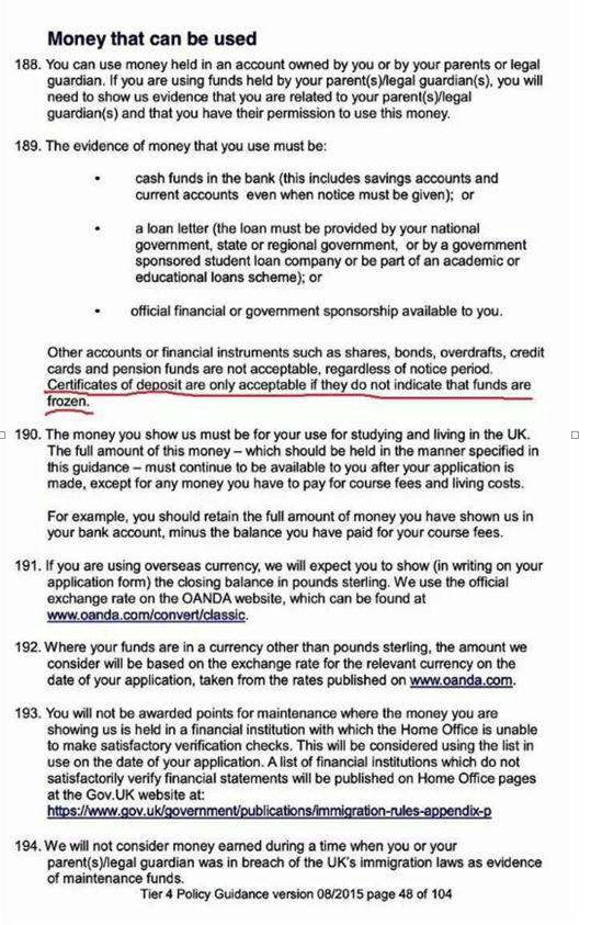 请注意英国边境总署在最新发布的Tier 4学生签证指南中注明了资金证明不能有Frozen(冻结)字样。