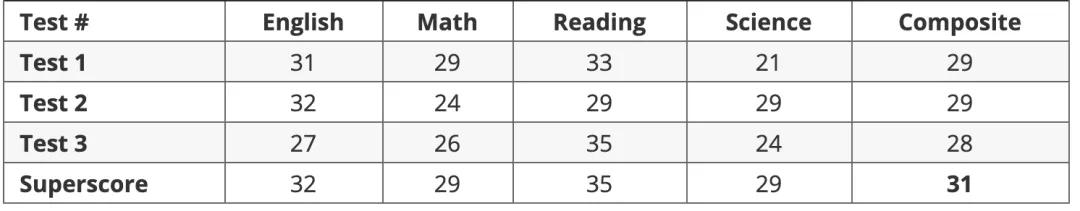 每一部分的分值区间在1-36,每部分的分数加在一起得到的平均分数就是总的ACT分数,区间也在1-36。从2020年9月开始,学生将获得一个新的“超级分数”(Superscore),该分数将合并他们每次参加考试时在各小节中获得的最高分数。