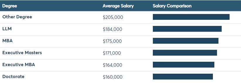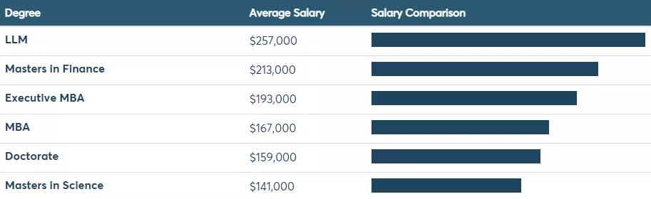 芝加哥大学最高薪学位是法学硕士,校友的平均薪资为257,000美元。学校毕业生中,薪水最低的是那些拥有其他硕士学位的人,年薪约为70,000美元。