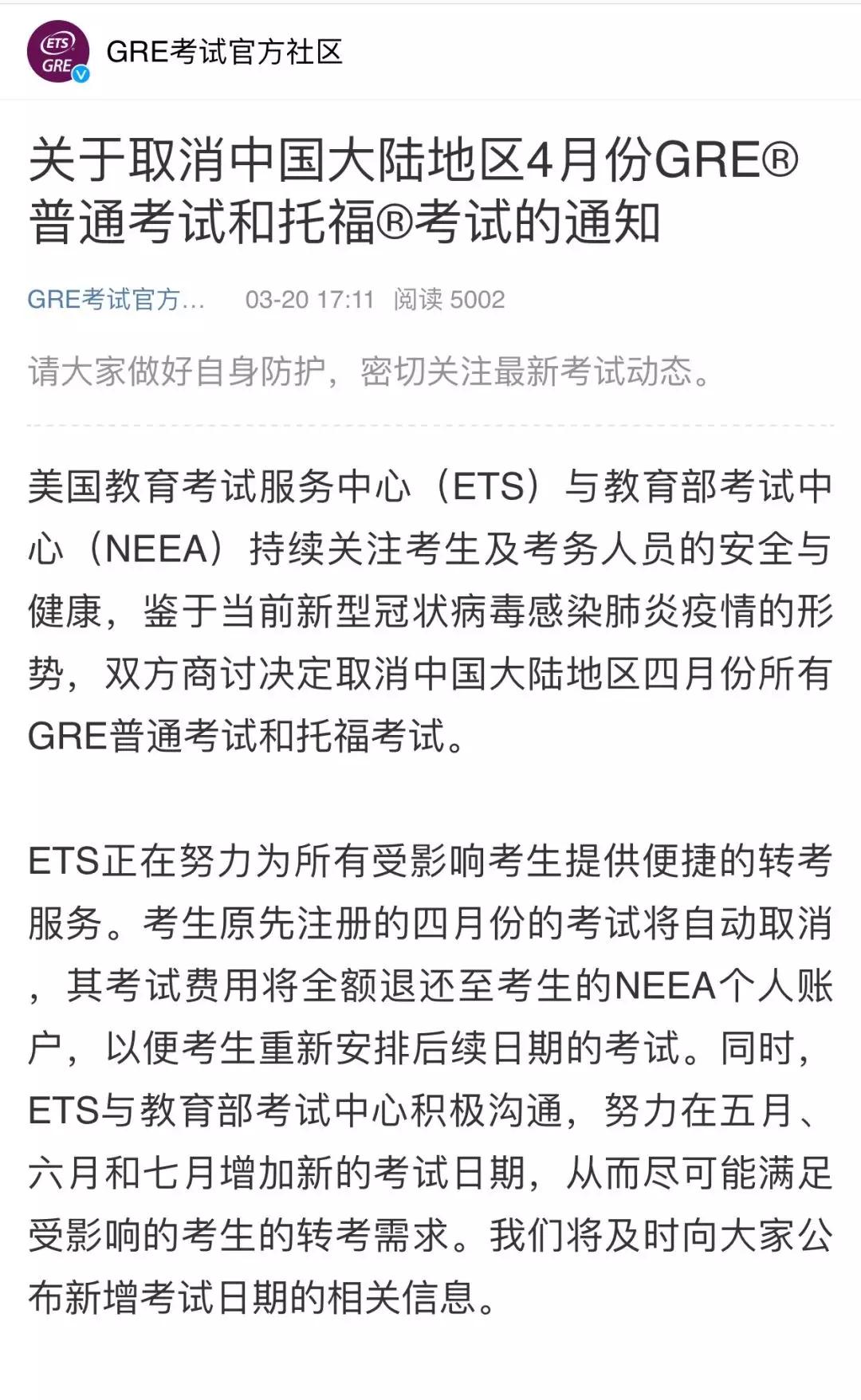 三、托福考试及GRE考试官方宣布取消在中国大陆地区4月份所有考试!所有原定于4月考试的考生可以免费转考至其他月份,考试费用将全额返还到NEEA账号以便转考其他日期。
