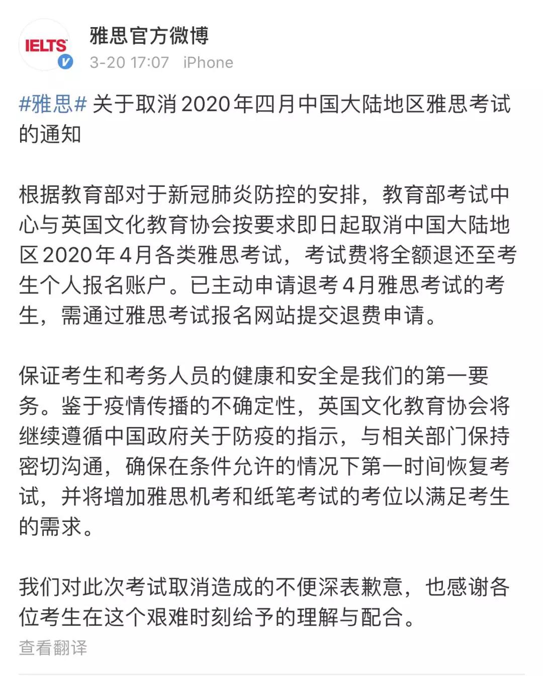 一、雅思官方宣布:中国大陆地区4月所有考试正式取消!